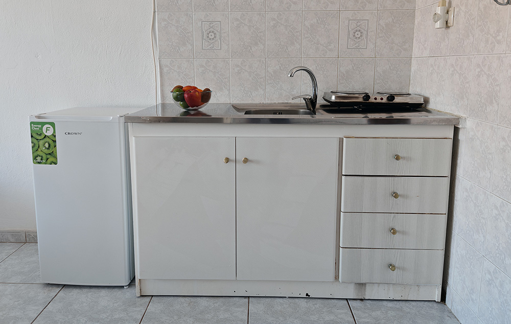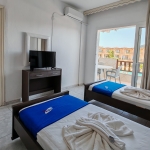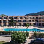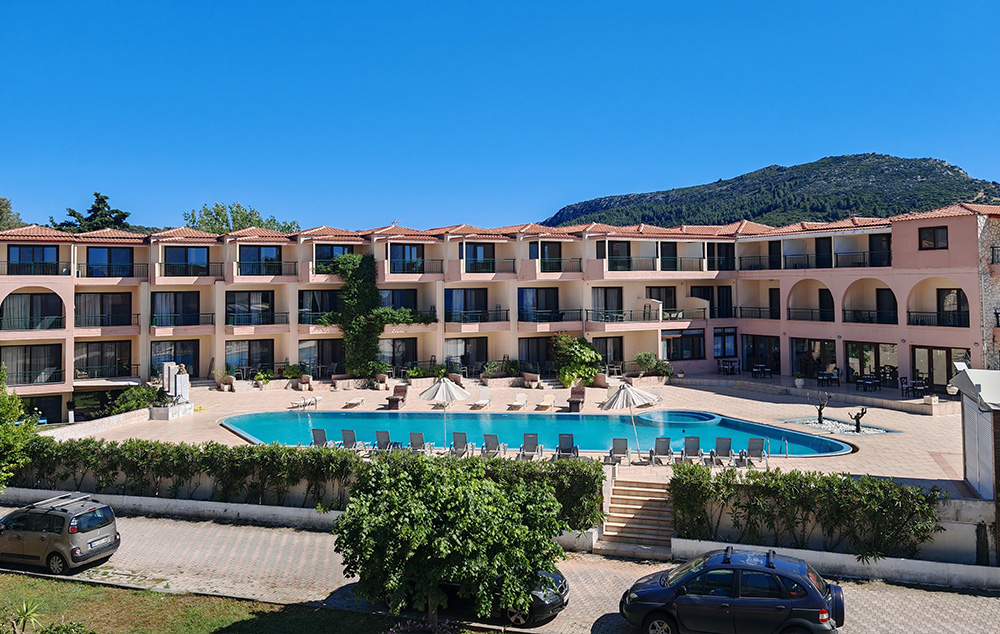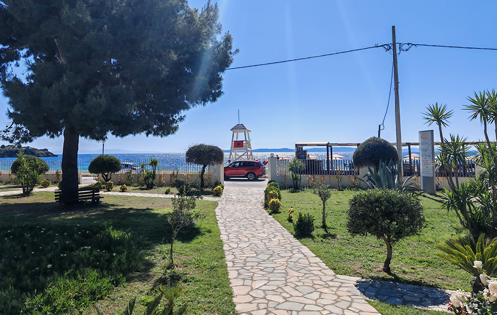 Nalazi se na samoj plaži, u sklopu hotela Blue Sea. U ponudi su studiji i apartmani za 2-4 osobe koji se nalaze u prizemlju, na prvom i drugom spratu. Jedni su sa bočnim pogledom na more, a drugi povoljniji nemaju pogled na more. Sve smeštajne jedinice imaju TV i klima uređaj čije je korišćenje uključeno u cenu. Gostima su na raspolaganju veliki i dečiji bazen uz konzumaciju pića, kao i parking. Moguća je doplata polupansiona u hotelskom restoranu.